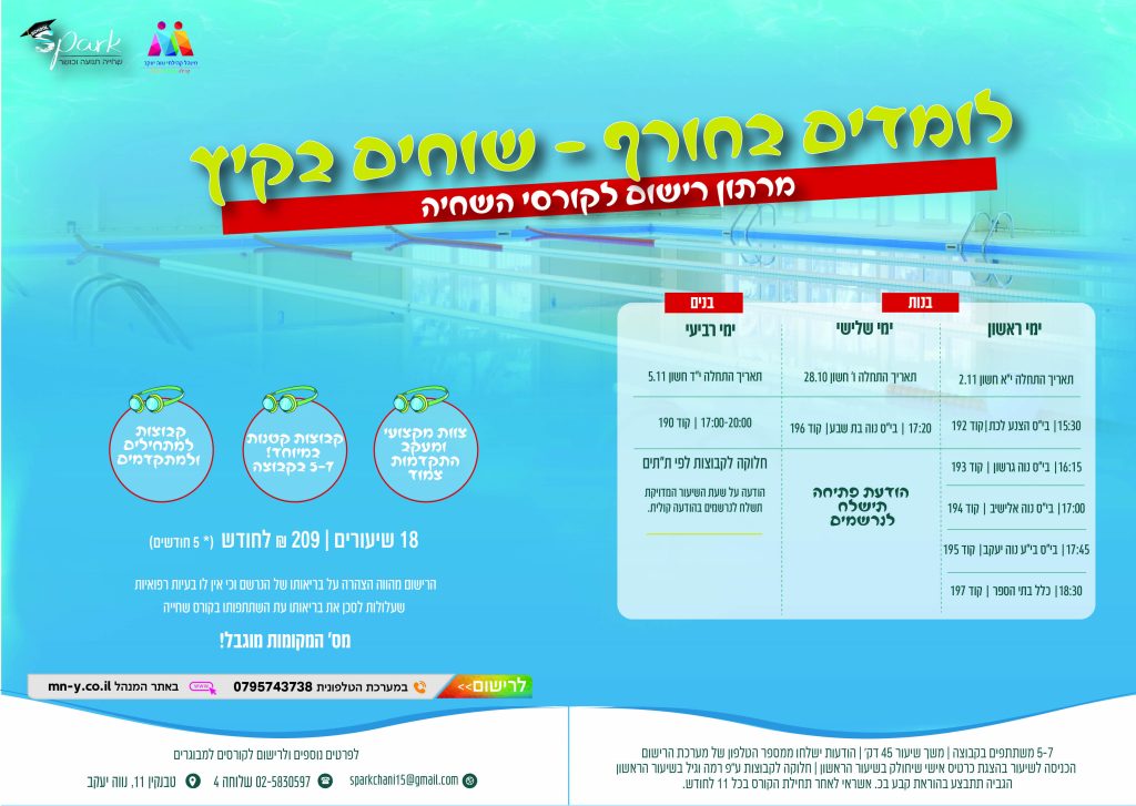 לימוד שחיה בית ספר לשחיה שיעורי שחיה לילדים ומבוגרים בבריכה מקורה ומחוממת, בהתאמה תרבותית ומגזרית מלאה לציבור החרדי והכללי.השיעורים ניתנים למתחילים ומתקדמים, במסגרת פרטית או קבוצתית ובמחיר מיוחד למוסדות חינוך, חינוך מיוחד, קבוצות נוער, ארגונים וחברות. לשליחת הודעה בקשר ללימודי שחיה ניתן לשלוח כאן! שם אימייל הודעה שליחה