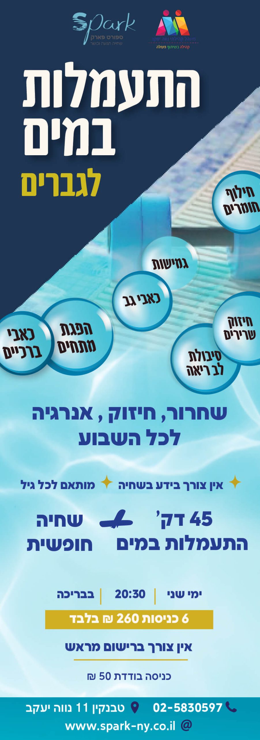 זקוקים לשיקום או סובלים מנכות? הבריכה הטיפולית שלנו מונגשת לנכים ומציעה שיעורי ספורט במים, לנשים גברים וילדים, בקבוצות נפרדות.